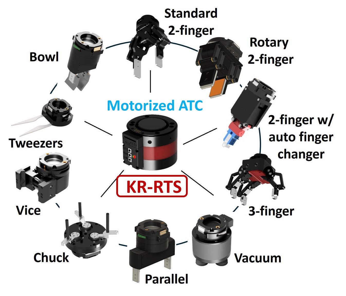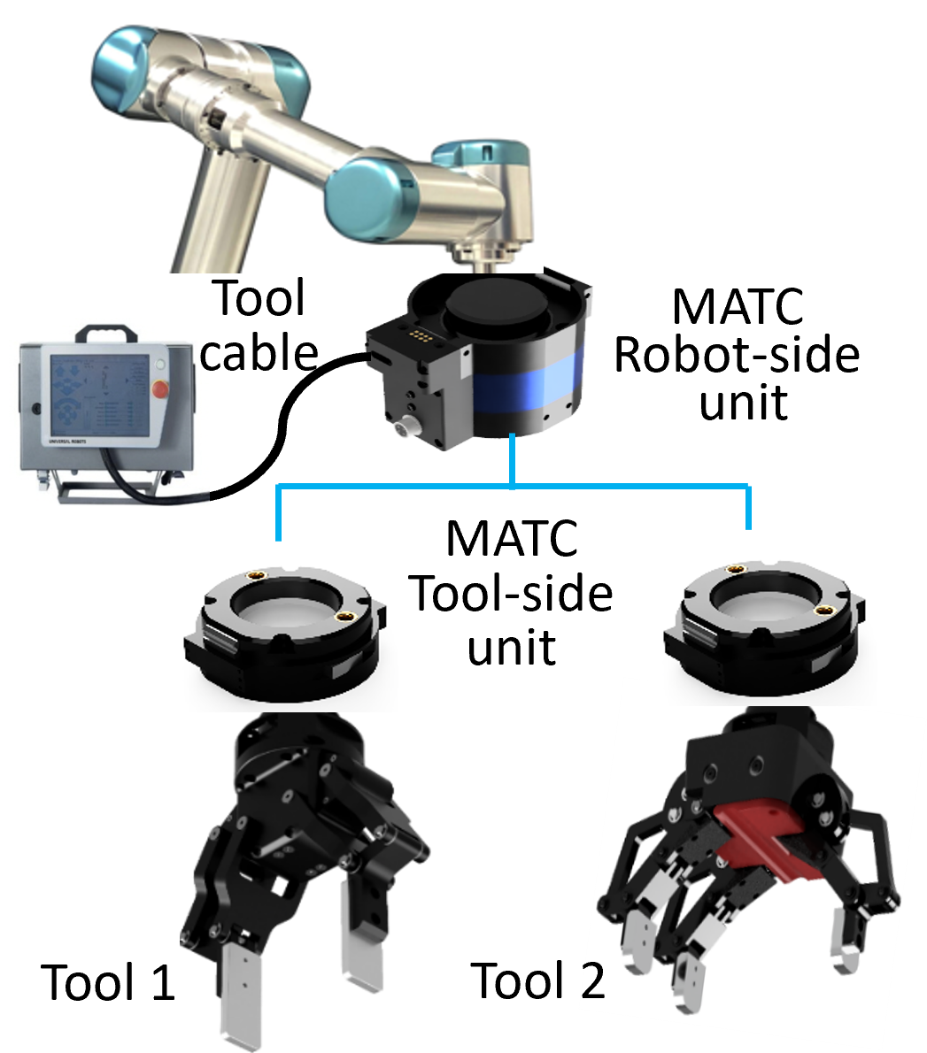 - Since all tools share a single drive unit embedded in the MATC robot-side unit, the robot remains constantly connected via a single tool cable (power and communication).
